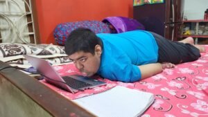 থুতনি দিয়ে অনায়াসে চালান ল্যাপটপ, মোবাইল। সাধারণ পেন মুখে ঢুকিয়ে সকাল থেকে রাত পর্যন্ত চলে তার পড়াশোনা, লেখালেখি। ছোট থেকে নিজেকে বিশেষভাবে সক্ষম না ভেবে আর সাধারণ পাঁচজন ছেলে মেয়েদের মত নিজেকে প্রতিষ্ঠিত করার লড়াই শুরু করেছেন। ছোটবেলায় একাধিক জায়গায় চিকিৎসা হলেও আর সাধারণের মতো জীবন ফিরিয়ে দিতে পারেনি চিকিৎসকরা। তবে নিজের শারীরিক প্রতিবন্ধকতাকে পিছনে ফেলেই সমাজে প্রতিষ্ঠার দৌড়ে এগিয়ে চলেছে সে। লক্ষ্য আইআইটি থেকে এমটেক করার। বিটেক করার পর সম্প্রতি এই বিষয় নিয়ে নিজেই প্রস্তুতি নিচ্ছে সে।
