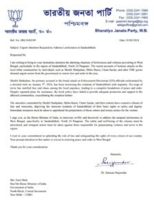 এরপরই সন্দেশখালির পরিস্থিতি নিয়ে উদ্বেগ প্রকাশ করে অমিত শাহকে চিঠি লেখেন সুকান্ত মজুমদার। সন্দেশখালিতে কেন্দ্রীয় হস্তক্ষেপ দাবি করেন তিনি।