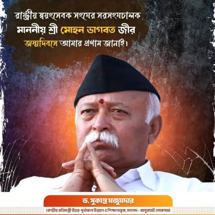 আমাদের ভারত, ১১ সেপ্টেম্বর: “রাষ্ট্রীয় স্বয়ংসেবক সঙ্ঘের সরসঙ্ঘচালক পরম পূজ্য শ্রী মোহন ভাগবত জীর জন্মদিবসে জানাই আমার হৃদয়ের অন্তঃস্থল থেকে আন্তরিক শুভকামনা,গভীর শ্রদ্ধা ও প্রণাম।” বৃহস্পতিবার এক্সবার্তায় এ কথা লিখলেন কেন্দ্রীয় মন্ত্রী তথা পশ্চিমবঙ্গ রাজ্য বিজেপি-র প্রাক্তন সভাপতি ডঃ সুকান্ত মজুমদার।