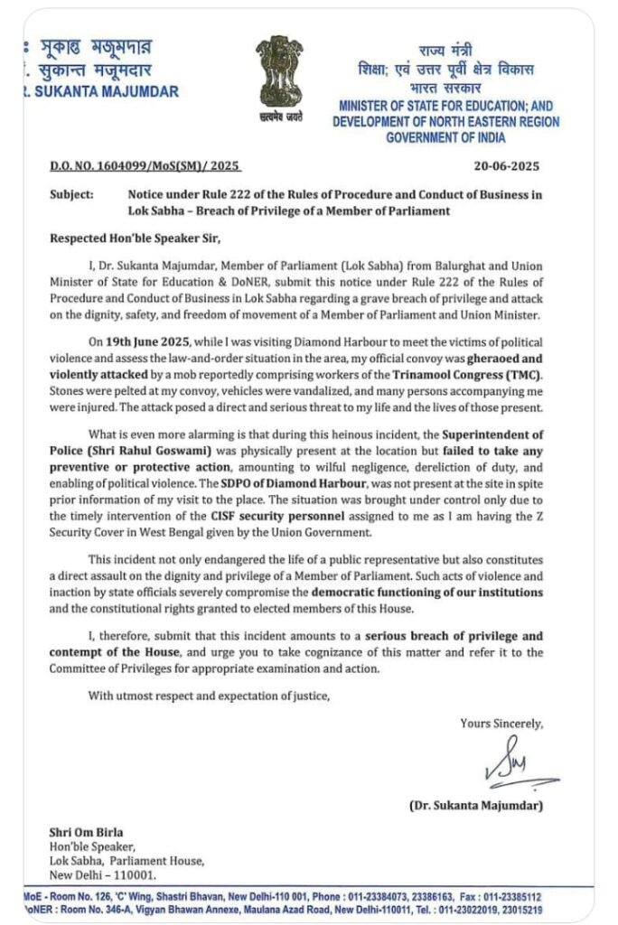 এই ধরনের ঘটনা একজন সাংসদের সম্মানহানি ও অধিকার ভঙ্গের সমান। তাঁর অভিযোগ, সাংসদকে অপমান করা হয়েছে। বিষয়টি সংসদের প্রিভিলেজ কমিটির কাছে পাঠানোর আর্জি জানিয়েছেন সুকান্ত মজুমদার।