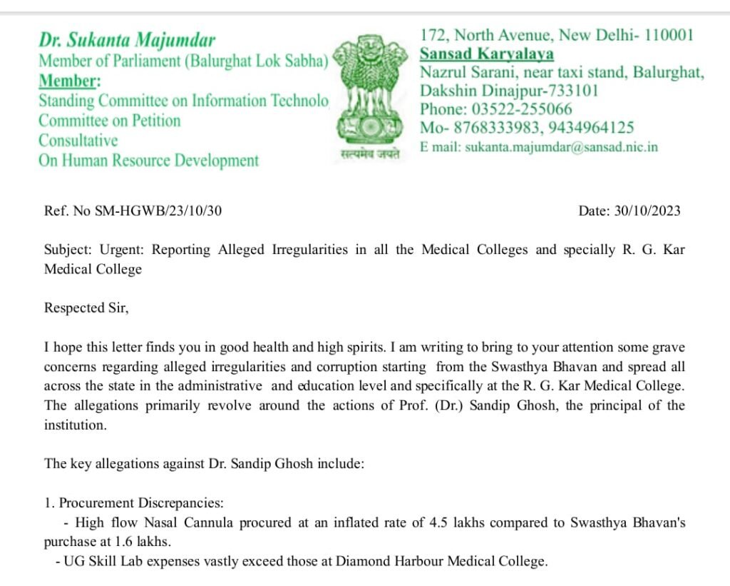 এ ছাড়াও সুকান্তবাবু অভিযোগ পত্রে লেখেন, ‘আর জি কর-সহ রাজ্যের প্রায় সব সরকারি মেডিক্যাল কলেজে দুর্নীতি ও অনিয়ম চলছে। টেন্ডার ডাকা থেকে চিকিৎসা সরঞ্জাম কেনা, সব ক্ষেত্রেই দুর্নীতি। স্বাস্থ্য ভবন থেকে শুরু হয়ে মেডিক্যাল কলেজগুলিতে ছড়িয়ে পড়েছে দুর্নীতি’।