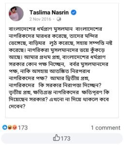 তসলিমা বরাবর বাংলাদেশে সংখ্যালঘুদের ওপর হওয়া অত্যাচারের বিরুদ্ধে সরব। প্রায়শই তাঁকে দেখা গেছে সংখ্যালঘুদের উপর জেহাদিদের অত্যাচারের বিরুদ্ধে কথা বলতে। আবারও তিনি এই বিষয়ে সরব হয়েছেন সোশ্যাল মিডিয়ায়। নিজের অ্যাকাউন্টের দেওয়ালে তিনি লিখেছেন, “বাংলাদেশের ধর্মপ্রাণ মুসলমান বাংলাদেশের নাগরিকদের মারধর করেছে, তাদের মন্দির ভেঙ্গেছে, বাড়িঘর লুঠ করেছে, সহায় সম্পত্তি নষ্ট করেছে। নাগরিকরা মুসলমানদের ভয়ে কুঁকড়ে আছে।” তিনি প্রশ্ন তুলেছেন, “বাংলাদেশের ধর্মপ্রাণ সরকার কোন পক্ষ নিচ্ছেন? বর্বর মুসলমানদের পক্ষ, নাকি অসহায় আতঙ্কিত নিরপরাধ নাগরিকদের পক্ষ?”
