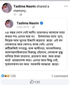 এটি ছাড়াও অপর একটি পোস্টে তসলিমা লিখেছেন, “২৪ বছর দেশে নেই আমি। তারপরও আমাকে হত্যা করার শখ এদের যায় না। ইসলামের নামে ঘৃণা, বিদ্বেষ আর খুনের উস্কানি ছড়ানো ছাড়া এই বদ লোকদের আর কোনও কাজ নেই। এদের রুটিরুজিই গণতন্ত্র, বাক স্বাধীনতা, মানবাধিকার, অসাম্প্রদায়িকতার বিরুদ্ধে চেঁচানো, লোককে বুদ্ধু বানিয়ে টাকা হাতানো, প্রতারণা করা আর রাস্তা ঘাটে ভায়োলেন্স করা। এদের আর কিছু নেই, মূর্খ লোকসংখ্যা আর সরকারি আস্কারা ছাড়া।”