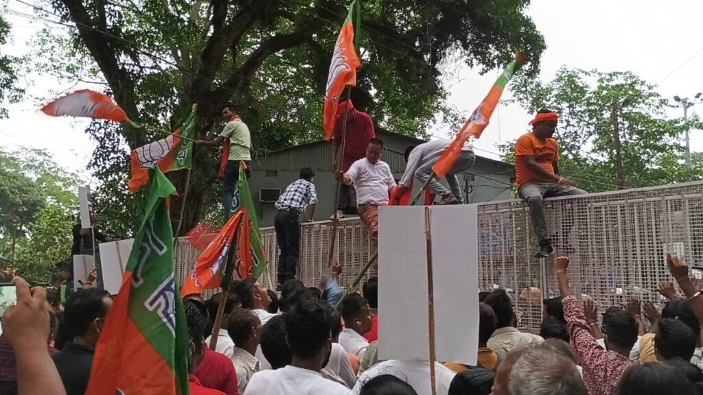 আমাদের ভারত, জলপাইগুড়ি, ২২ এপ্রিল: জলপাইগুড়ি জেলা বিজেপি পুলিশ সুপার দফতর অভিযানকে কেন্দ্র করে উত্তেজনা। লোহার ব্যারিকেড দিয়ে আটকে দেওয়া হলো বিজেপি নেতা কর্মীদের। পুলিশকে লক্ষ্য করে ঢিল, জলের বোতল ও বাঁশ দিয়ে গুঁতো দেওয়ার অভিযোগ উঠল। ঘটনাকে কেন্দ্র করে মঙ্গলবার শহরের পুলিশ সুপার দফতরের সামনে উত্তেজনা ছড়ায়। লোহার ব্যারিকেড টপকে যাওয়ার চেষ্টা করেন বিজেপি নেতা কর্মীরা।