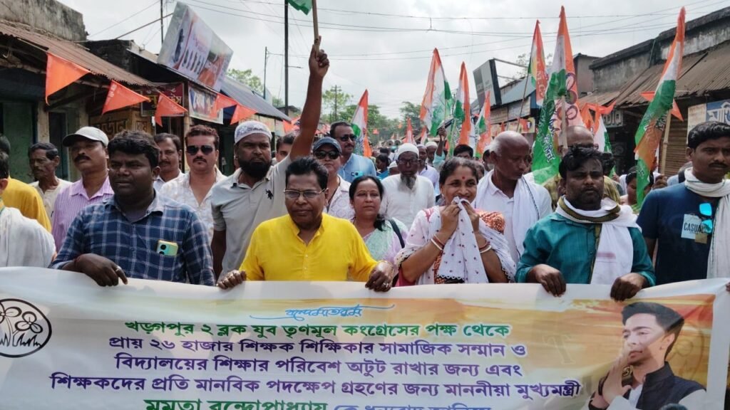 পার্থ খাঁড়া, আমাদের ভারত, পশ্চিম মেদিনীপুর, ৮ এপ্রিল: চাকরিহারা শিক্ষক- শিক্ষিকাদের পাশে দাঁড়াতে এদিন তৃণমূল বিধায়ক অজিত মাইতির নেতৃত্বে জেলার মাদপুরে মিছিল করেন তৃণমূলের কর্মী সমর্থকরা। বিজেপি এবং সিপিএমের চক্রান্তের ফলেই জেলার ১৫০০ শিক্ষক-শিক্ষিকা চাকরি হারিয়েছেন এই অভিযোগ তুলে মিছিলে স্লোগান দেওয়া হয়।