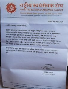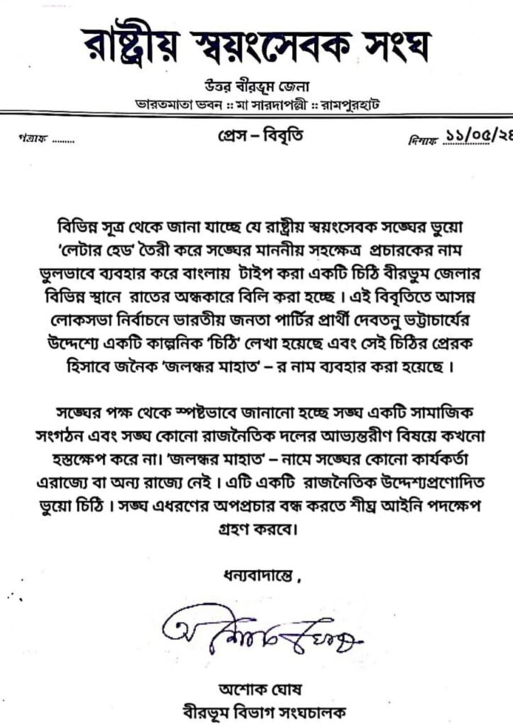 আশিস মণ্ডল, সিউড়ি, ১১ মে: ভুয়ো পোস্টারের পর এবার ভুয়ো চিঠি বীরভূম লোকসভার বিজেপি প্রার্থী দেবতনু ভট্টাচার্যের বিরুদ্ধে। এবার রাষ্ট্রীয় স্বয়ং সেবকের লেটার হেড ব্যবহার করে সমাজ মাধ্যমে চিঠি ছড়িয়ে দেওয়া হয়েছে। বিষয়টি জানতে পেরে তড়িঘড়ি ভুয়ো চিঠির জবাব দিয়েছে আরএসএস।
