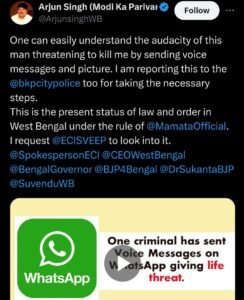 আমাদের ভারত, ব্যারাকপুর, ২৪ মে: বারাকপুর লোকসভা কেন্দ্রের বিজেপি প্রার্থী অর্জুন সিং কে প্রাণে মেরে ফেলার হুমকি। একটি অডিও মেসেজে এই হুমকি দেওয়া হয়েছে। মেসেজটি পাঠানো হয়েছে হোয়াটসঅ্যাপে।
