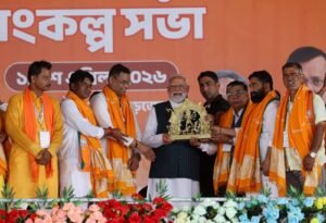 সোমনাথ বরাট, আমাদের ভারত, বাঁকুড়া, ১৯ এপ্রিল: বড়জোড়ায় আয়োজিত জনসভায় জনসুনামি দেখে আপ্লুত প্রধানমন্ত্রী নরেন্দ্র মোদী। তিনি বলেন, জনসমাগমই পরিবর্তনের বহিঃপ্রকাশ। মমতা বন্দ্যোপাধ্যায়কে এবার রাজ্য ছাড়া করেই ছাড়বো। মহিলা সংরক্ষণ বিলে বেহেনদের ধোঁকা দিয়েছে টিএমসি, ওদেরকে সাজা দেবেন না? আজ সকালে বড়জোড়ার ফুলবেড়িয়া ফুটবল গ্রাউন্ডে বিজয় সংকল্প সভায় আসন্ন বিধানসভা নির্বাচনে রাঢ় বাংলায় পদ্ম ফোটাতে দুর্নীতি ও তোষণ ইস্যুতে তৃণমূল এবং কংগ্রেসকে কড়া আক্রমণ করেন মোদী।