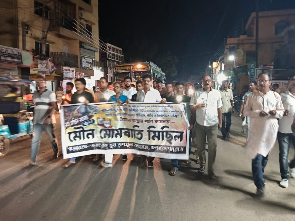 পার্থ খাঁড়া, আমাদের ভারত, পশ্চিম মেদিনীপুর, ২৩ এপ্রিল: কাশ্মীরের পেহেলগাঁও’য়ে জঙ্গি হামলার ঘটনার প্রতিবাদ জানিয়ে ও নিহতদের আত্মার শান্তি কামনায় বুধবার সন্ধ্যায় পশ্চিম মেদিনীপুর জেলার গড়বেতা তিন নম্বর ব্লকের চন্দ্রকোনারোড শহরে মৌন মিছিল করল ব্লক যুব তৃণমূলের কর্মী- সমর্থকরা। এদিন হাতে মোমবাতি জ্বালিয়ে এই মৌন মিছিল গোটা শহর পরিক্রমা করে।