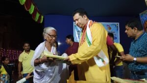 পার্থ খাঁড়া, আমাদের ভারত, পশ্চিম মেদিনীপুর, ৮ অক্টোবর: তৃতীয়া ও চতুর্থী থেকে শুরু হয়ে গেছে পশ্চিম মেদিনীপুরে একাধিক পুজোর উদ্বোধন। ইতিমধ্যেই দর্শনার্থীদের ভিড় ছিল মন্ডপে মন্ডপে। তবে সকল মানুষ যাতে সমান সুবিধা ভোগ করে এবং নতুন জামা পরে মন্ডপে ঠাকুর দেখতে যেতে পারে তার জন্য উদ্যোগী হল মেদিনীপুর পৌরসভার ৯ নং ওয়ার্ড কাউন্সিলর বিপ্লব বসু ওরফে সৌরভ। মূলত ঌ নম্বর ওয়ার্ড কমিটির ব্যবস্থাপনায় আসন্ন শারদীয়া উপলক্ষে এলাকায় সাত শতাধিক দুঃস্থ মানুষের হাতে নতুন বস্ত্র তুলে দেওয়া হল।