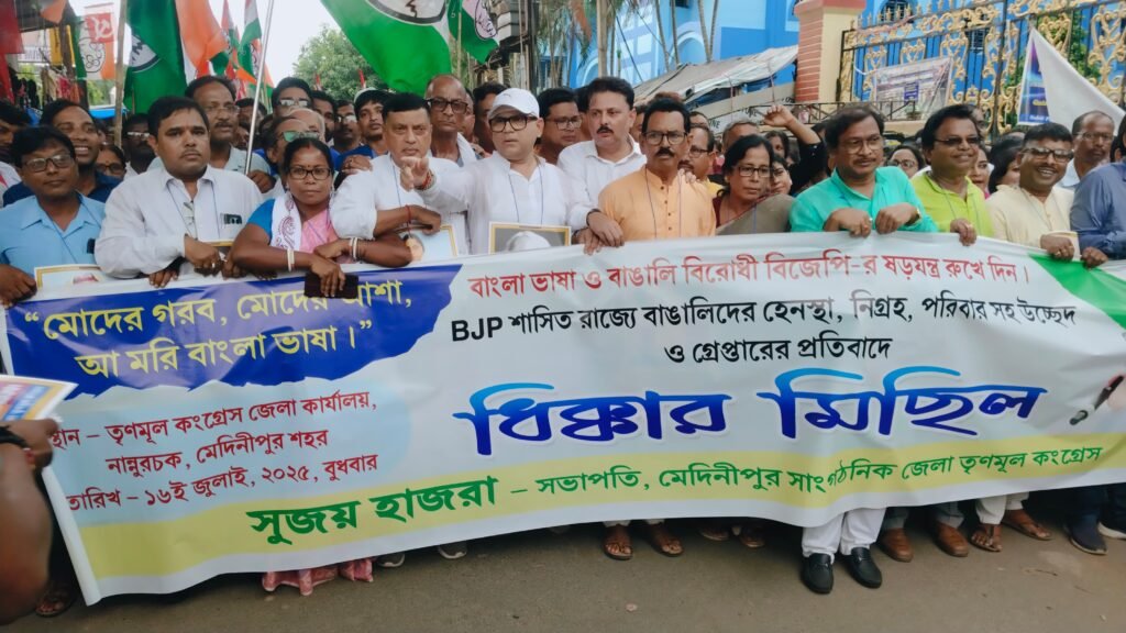 পার্থ খাঁড়া, আমাদের ভারত, পশ্চিম মেদিনীপুর, ১৬ জুলাই: আগামী ২১ জুলাইকে সামনে রেখে সারা রাজ্যজুড়ে চলছে তৃণমূলের প্রস্তুতি পর্ব। বুধবার পশ্চিম মেদিনীপুর জেলার মেদিনীপুর সাংগঠনিক জেলা তৃণমূল কংগ্রেসের ডাকে ২১ জুলাইকে সামনে রেখে এবং বিজেপি শাসিত রাজ্যে বাঙ্গালিদের উপর নিলর্জ্জভাবে অত্যাচারের বিরুদ্ধে এবং সাম্প্রদায়িক রাজনীতির বিরুদ্ধে মেদিনীপুর শহরে পদযাত্রা ও পথসভার আয়োজন করল তৃণমূল। এদিন এই পদযাত্রায় কয়েক হাজার তৃণমূল কর্মী সমর্থক উপস্থিত ছিলেন।