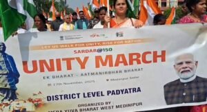 পার্থ খাঁড়া, আমাদের ভারত, পশ্চিম মেদিনীপুর, ১৭ নভেম্বর: সর্দার বল্লভভাই প্যাটেলের জন্মের ১৫০ বছর পূর্তি উপলক্ষে মেরা যুব ভারত, পশ্চিম মেদিনীপুর-এর উদ্যোগে আজ মেদিনীপুর শহরে অনুষ্ঠিত হলো বর্ণাঢ্য “ইউনিটি মার্চ” কর্মসূচি। সকালেই কলেজ মাঠের সামনে থেকে এই পদযাত্রার সূচনা হয়, যেখানে শহরজুড়ে দেশাত্মবোধের আবহ ছড়িয়ে পড়ে।