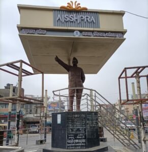 ছবিতে লেখায় উল্লেখিত রাস্তার মোড়ে সুভাষচন্দ্র বসুর মূর্তি, প্রশস্ত রাস্তা এবং চিত্রকূট মন্দিরের ছবি।