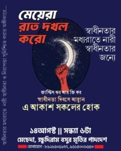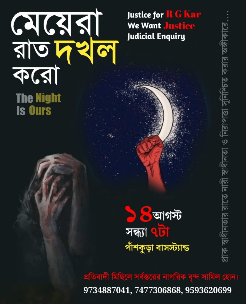 ওই আন্দোলনের ধারাবাহিকতায় ১৪ আগস্ট “নারীরা রাত দখল করো” এই স্লোগানকে সামনে রেখে দলহীন একটি প্রতিবাদ বিক্ষোভের কর্মসূচি ঘোষিত হয়েছে। ঐ কর্মসূচিকে সামনে রেখে পূর্ব মেদিনীপুর জেলার পাঁশকুড়া, কাঁথি, তমলুক, মেচেদা প্রভৃতি স্থানে মহিলারা মোমবাতি মিছিল, বিক্ষোভ সভা সহ নানাভাবে ওই কর্মসূচিতে সামিল হবে বলে জানা গেছে। নারী নিগ্রহ বিরোধী নাগরিক কমিটি ও নাগরিক সুরক্ষা কমিটি ওই কর্মসূচিকে সমর্থন জানিয়েছে।