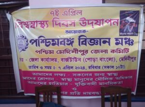 পার্থ খাঁড়া, আমাদের ভারত, পশ্চিম মেদিনীপুর, ৭ এপ্রিল: রবিবার সকাল ১০টা থেকে দুপুর ২টো পর্যন্ত সংগঠনের জেলা দপ্তরে বিশ্ব স্বাস্থ্য দিবসে বিনা ব্যয়ে সার্বিক স্বাস্থ্য শিবির পরিচালিত হয়। “আমার স্বাস্থ্য, আমার অধিকার” জনস্বাস্থ্য রক্ষার স্বার্থে এলাকার দুঃস্থ শিশু, মহিলা ও বয়স্ক মিলিয়ে প্রায় ১৫১ জনের স্বাস্থ্য পরীক্ষা করা হয়। বিশেষজ্ঞ ডাক্তারবাবু রোগী দেখেন ও পরামর্শসহ সাধ্যমত ওষুধ সংগঠনের তরফ থেকে তুলে দেওয়া হয়। ব্লাড প্রেসার পরিমাপ, ব্লাড গ্রুপ নির্ণয় ও তাৎক্ষণিক ব্লাড সুগার নির্ণয় করা হয় প্রায় ১৭০ জনের।