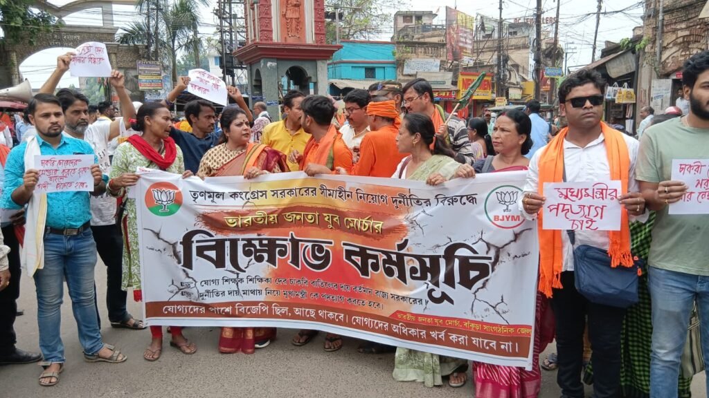 সোমনাথ বরাট, আমাদের ভারত, বাঁকুড়া, ৪ এপ্রিল: শিক্ষক নিয়োগ দুর্নীতি মামলায় রাজ্য সরকারের দায়িত্বহীন ভূমিকায় যোগ্য শিক্ষকদের চাকরি বাতিল হওয়ায় রাজ্য সরকারকে ধিক্কার জানিয়ে আজ মাচানতলা মোড়ে বিক্ষোভ দেখায় ভারতীয় জনতা যুব মোর্চা। আজ সকালে শহরের প্রাণকেন্দ্র মাচানতলায় যুবমোর্চার সদস্য সমর্থকরা এই ঘটনার প্রতিবাদে মুখর হয়ে ওঠেন।